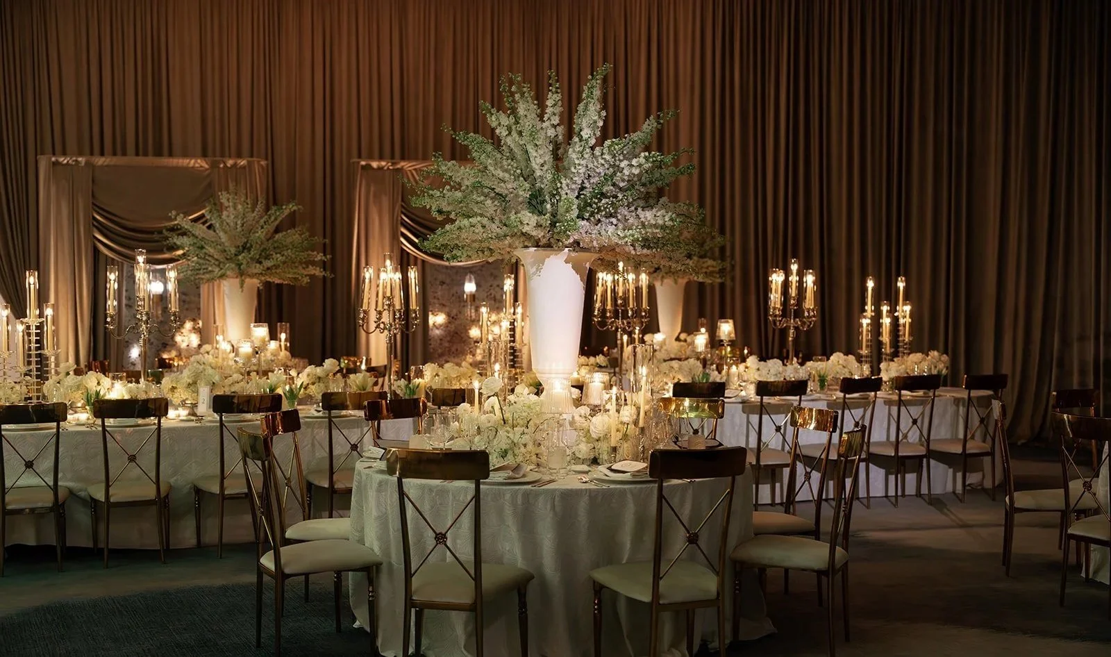 As evening fell, the celebration moved indoors to the ballroom, where the design shifted into something altogether more dramatic. Floor-to-ceiling silk drapery in warm taupe enveloped the space, while long banquet tables dressed in ivory damask were crowned with towering arrangements of snapdragons, clusters of white garden roses, and an abundance of candlelight that cast the room in a warm, flickering glow. A black and white marble dance floor was a nod to the grand ballrooms of another era, while lush floral installations framed the stage where a live band set the night in motion. Draped gold chairs and ornate gilded mirrors completed the scene — elegant, cinematic, and entirely unforgettable.